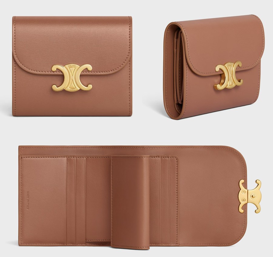 ♥  Celine Triomphe Small Flap Wallet 。(需登入帳號才知道能不能看到) CELINE經典三折短夾19045含稅,台灣24500=77! 用貨號去查官網是滿美的青銅色,但我覺得肉眼看就是乾燥玫瑰粉啊!