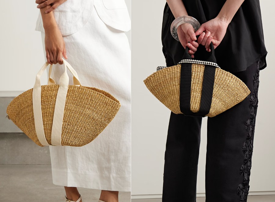 ♥ MUUÑ Sophie mini webbing-trimmed woven straw tote 。同款黑色迷你尺寸。
